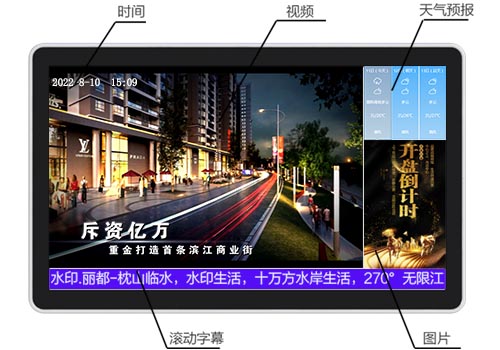 視頻、圖片、文本(滾動字幕)等多媒體文件上傳至服務(wù)器,制定各種多媒體組合播放內(nèi)容, 下發(fā)給各顯示終端,可設(shè)定循環(huán)、定時、定次、插播、墊片、流媒體直播等播放方式。