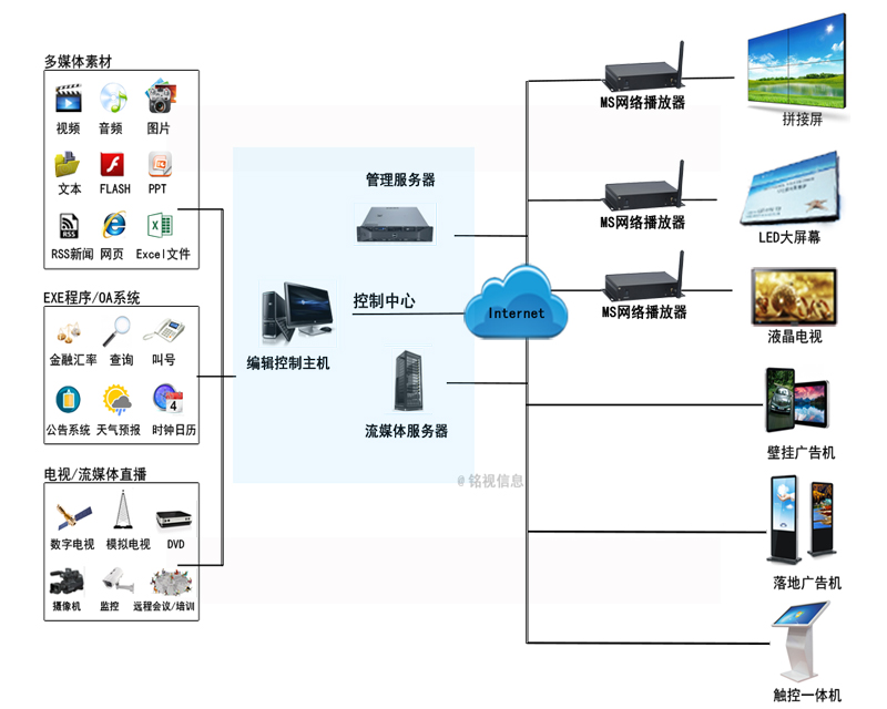 可搭建Linux服務(wù)器;最大負載終端數(shù)量大于1萬臺;支持多點同步播放;支持電視信號輸入。